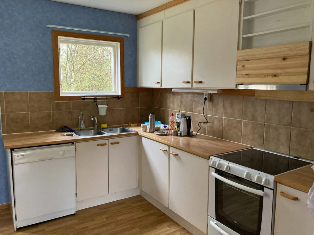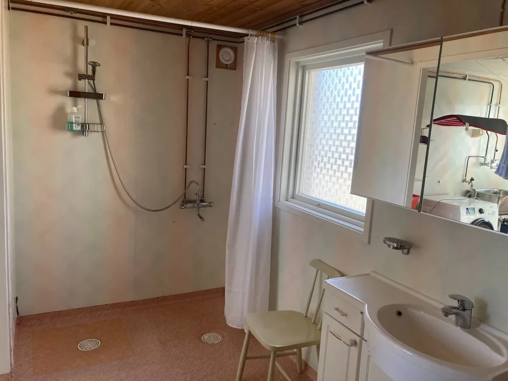 Das Haus hat eine Wohnfläche von 127 Quadratmeter und bietet Schlafmöglichkeiten für 5 Personen. Im Erdgeschoss ist das Kaminzimmer, ein Durchgangszimmer, eine große Küche, das Bad mit Dusche, die Waschküche und eine Gästetoilette sowie die Veranda. Im Obergeschoss ist das Schlafzimmer, das Fernsehzimmer mit Schlafcouch und dahinter noch ein kleiner Raum.